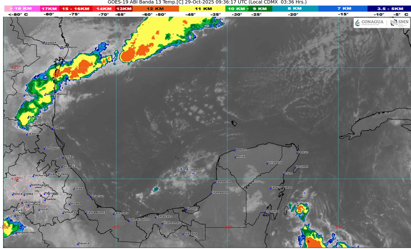 2.- El frente frío número once se localiza sobre la porción noreste del país y comenzará a recorrer la vertiente del golfo de México, genera viento fresco y arrachado del norte, lluvias y descenso de la temperatura sobre su área de influencia.