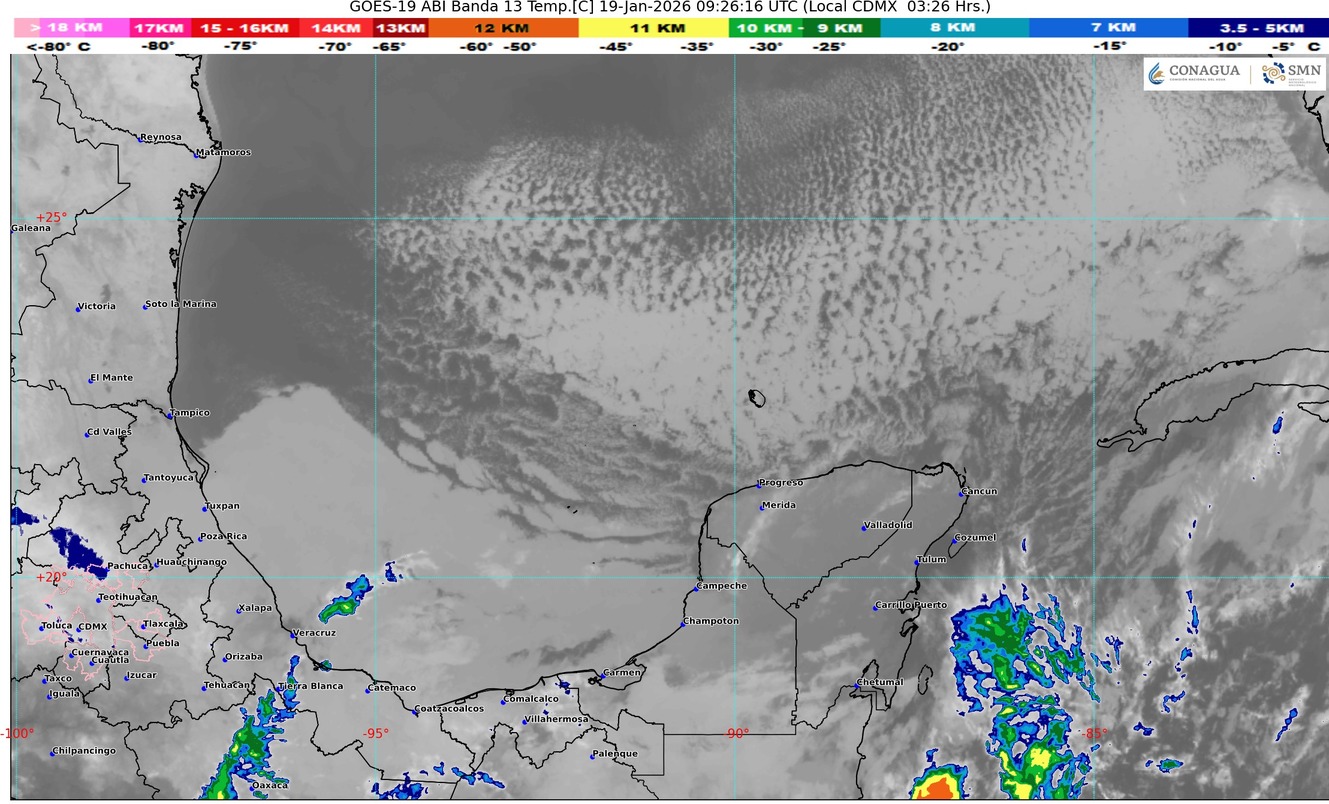 PERÍODO DE VALIDEZ: DE LAS 06:00 H DEL DÍA 19 DE ENERO, A LAS 06:00 H DEL DÍA 20 DE ENERO DE 2026. SINOPSIS: La masa de aire frío que impulsó al frente número Veintinueve, propiciará en Quintana Roo cielo parcialmente nublado a nublado durante el transcurso del día, lluvias y chubascos aislados (acumulados de … Leer más